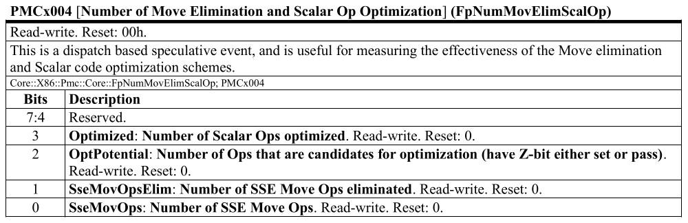Apart from eliminated moves, this also records cases where instructions are subject to the XMM register merge optimization. The documentation here also explicitly reminds us that both of these things occur speculatively at dispatch. This makes sense because both are optimizations that rely on the register map, and I guess it isn't too suprising that they're both involved in the bug.